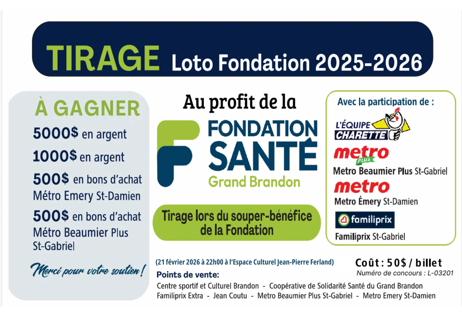 Bonne chance à tous, et merci de soutenir la Fondation Santé du Grand Brandon.